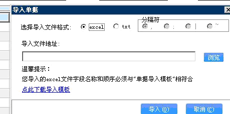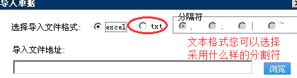 文本文件导入首先您在下载模板的时候,请选择txt格式,并且您还可以选择文本分割符(默认的为英文格式的逗号),如下图