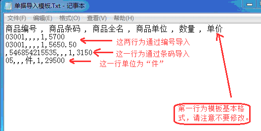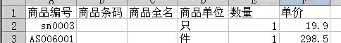 上图只是示例,其中商品编号和和商品条码必选其一,其他留空的如果要填写,必须和软件里面的对应的商品信息一致。