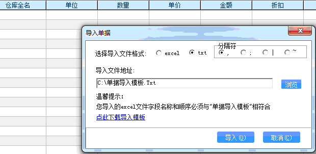 模板整理好之后,和上面讲的一样,点击单据右上角的导入图标,选择导入文件格式为txt格式,默认的分隔符我英文逗号,和我们模板的一样,不需要选择,