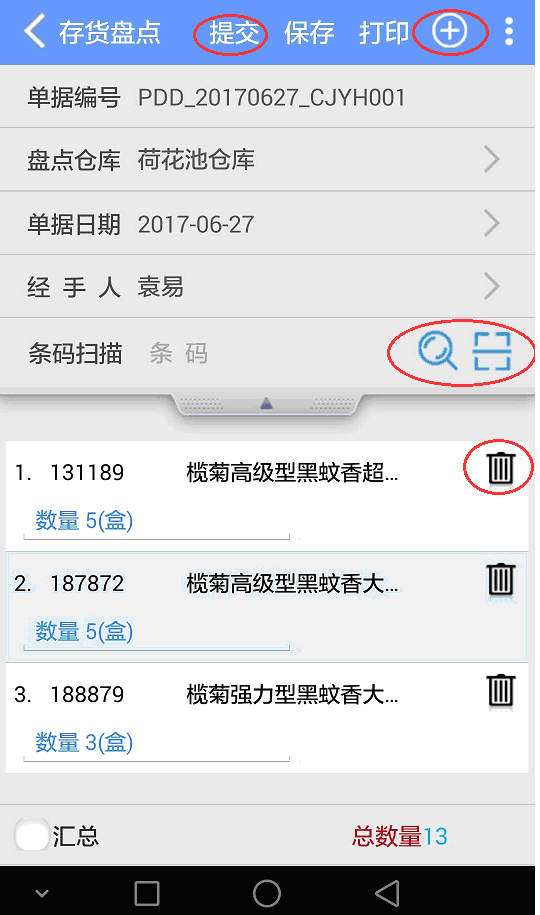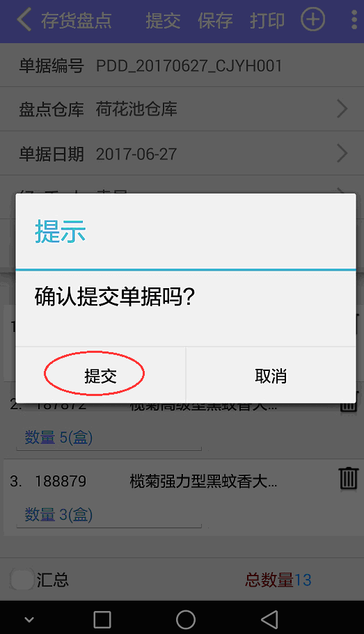盘点之后,点击保存是暂存在您的收据,点击提交才是直接提交到服务器。对于盘点错了的可以修改或者点删除。