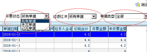 注意右上角可以点击下拉根据开票状态筛选单据。