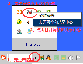 照图中说明依次点击打开网络和共享中心