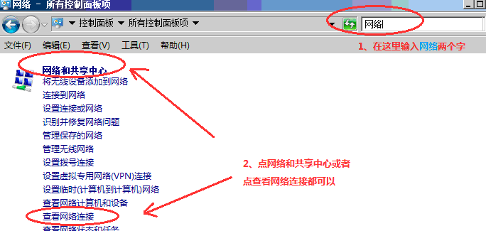 或者也可以直接打开控制面板,照下图中说明的方法来打开网络和共享中心。