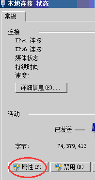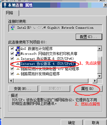 弹出本地连接状态窗口,然后点击属性,弹出下面的属性窗口照图示选择TCP/IPv4然后点击属性。